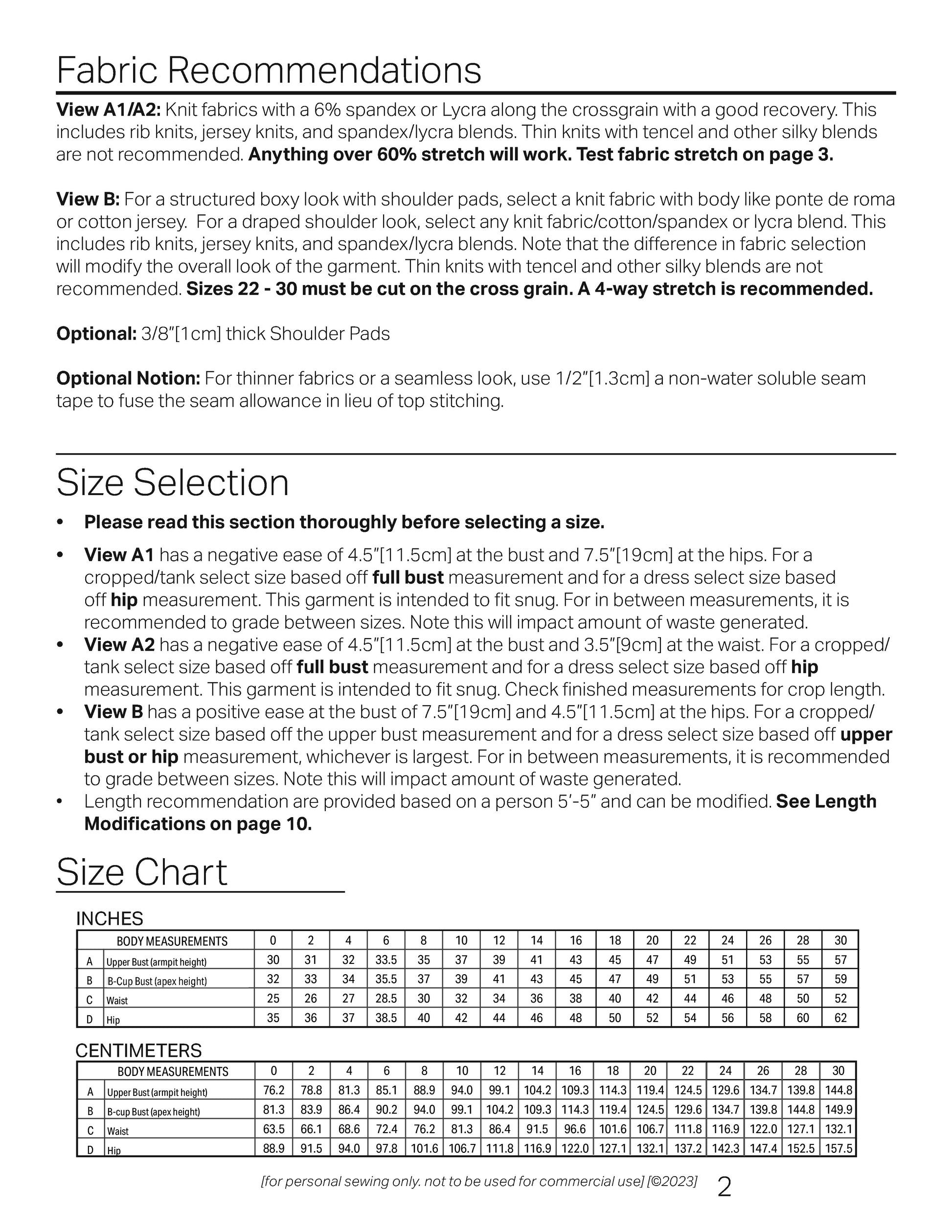 The goal of the design is to make a conscious effort to reduce fabric and paper waste whenever possible. The overall fabric size is provided with a minimal paper template to fit the armscye, shoulder and bust dart. Some pattern modification may be required.