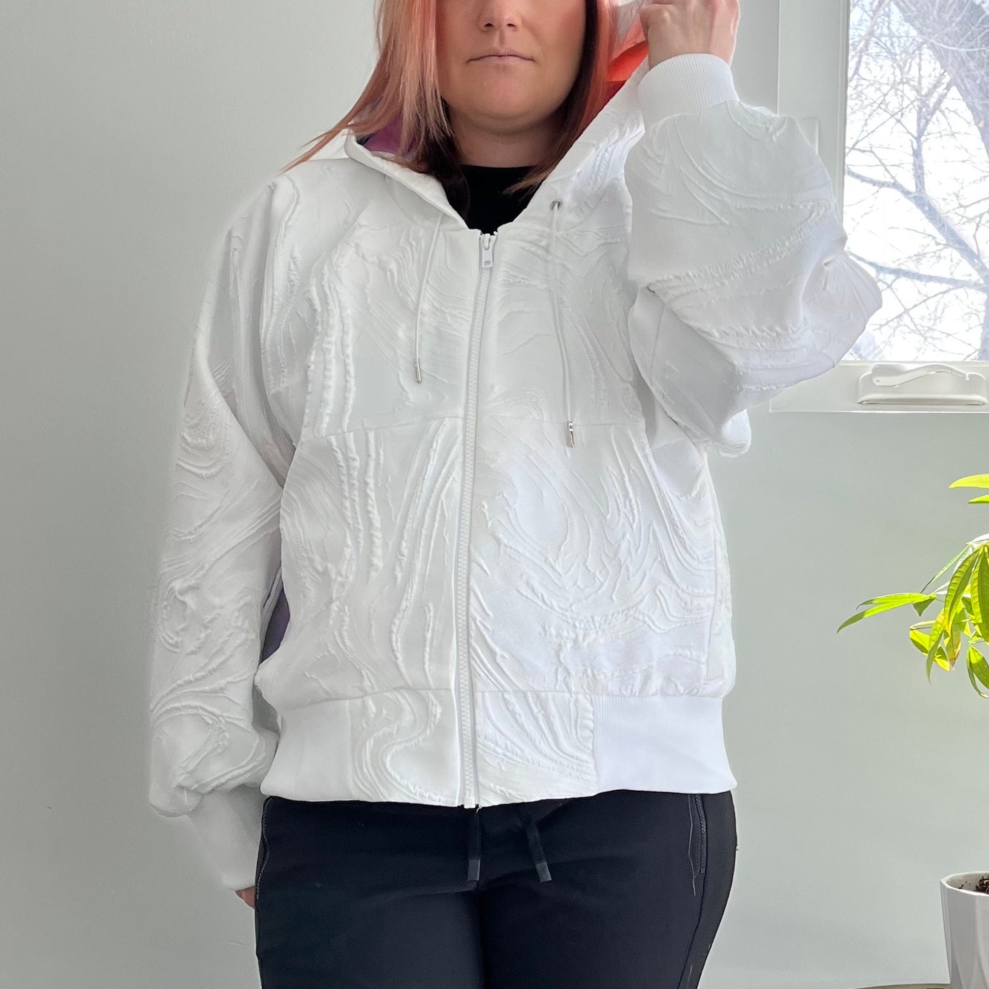 The jacket is both minimal in look and construction. The fit is oversized and boxy. Design features include a lined bomber jacket with a collar or hood option.