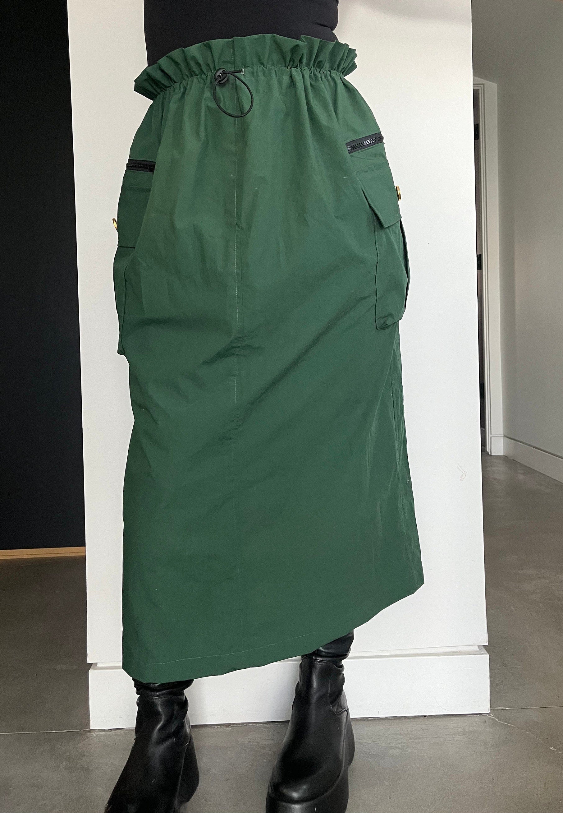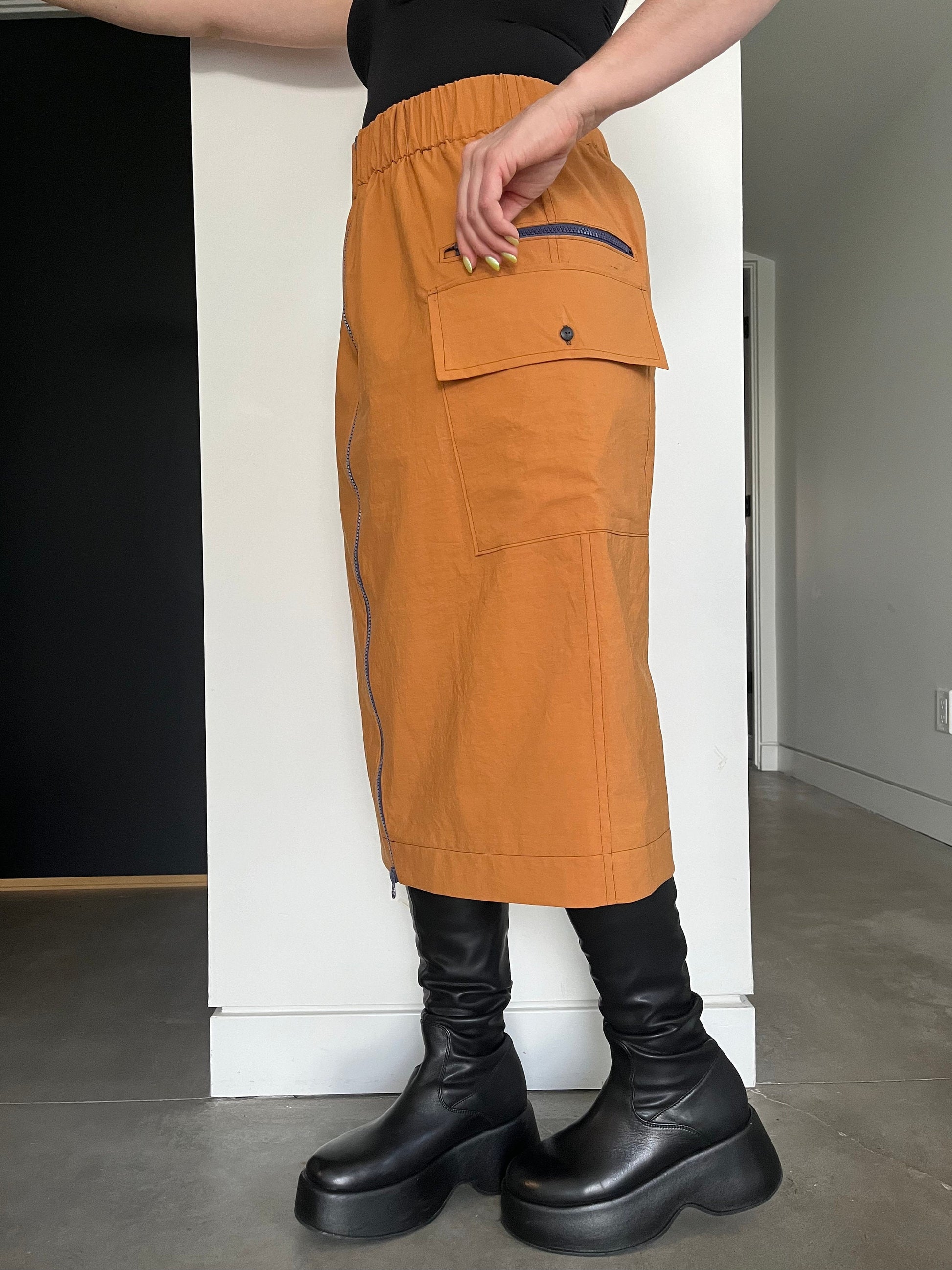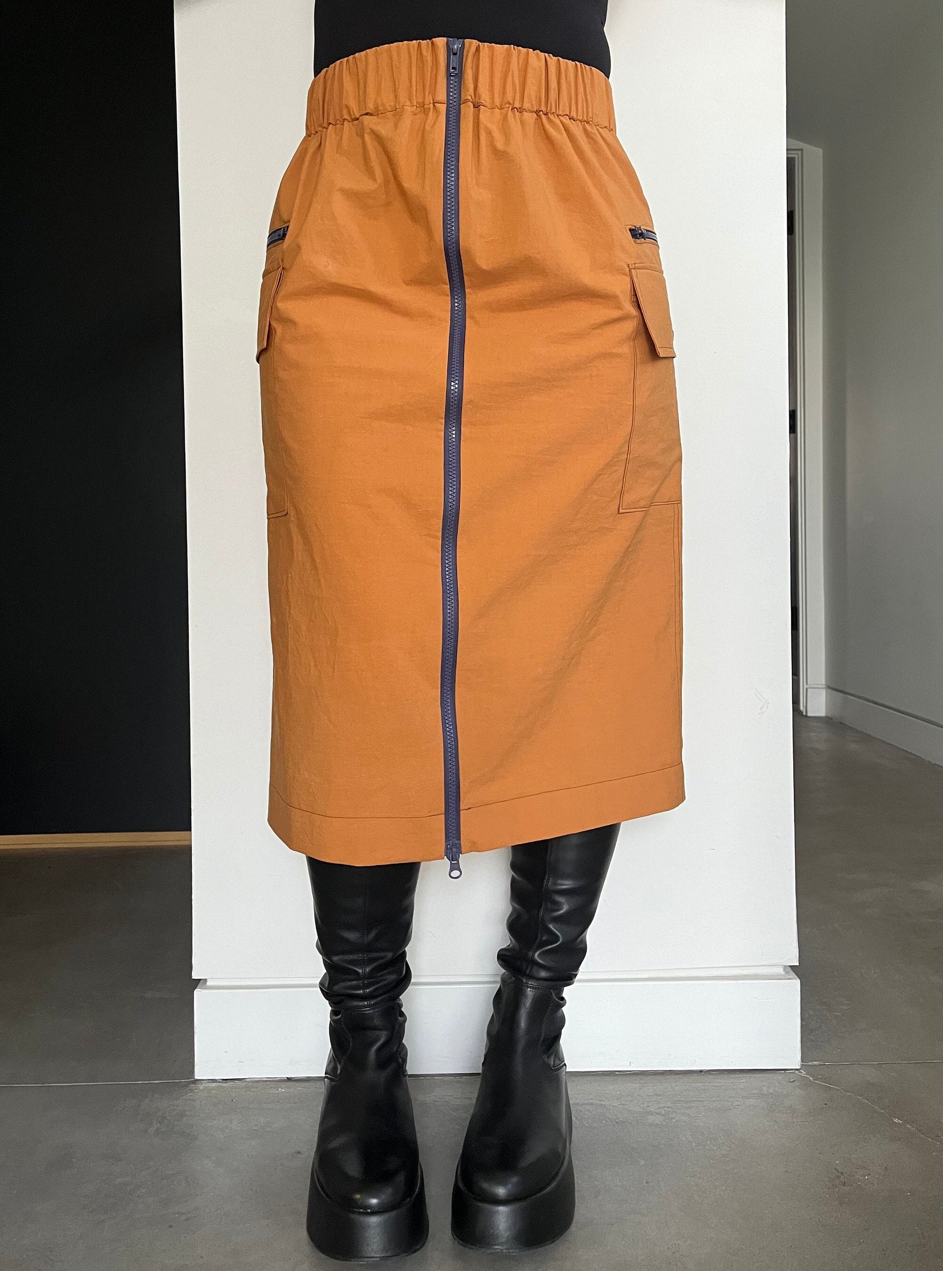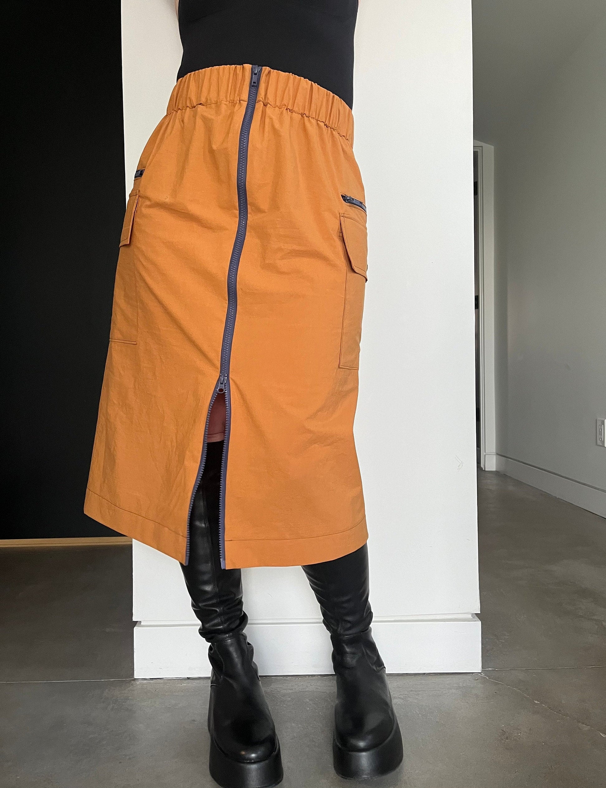 The zero waste cargo skirt is inspired by the classic 90’s cargo skirt many of us grew up loving. The skirt is cut from a single template with multiple waistband, pocket design and length variations along with custom sizing. Each design detail gives a different vibe from sporty casual to utility chic.
